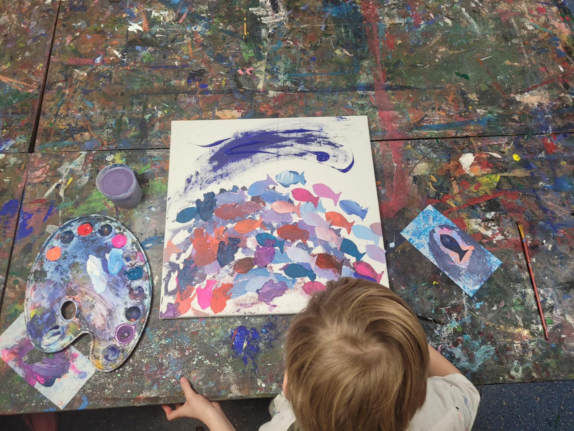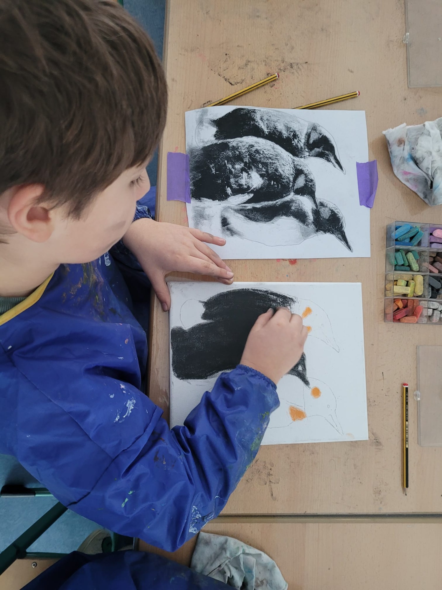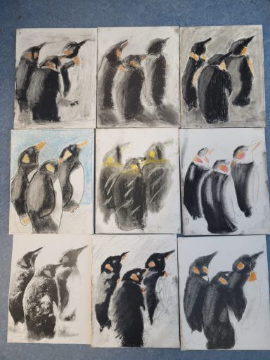 Zusammen mit den Kindern der OGS Straberg in der Kunst AG "Kunst und Tiere" unter der Leitung von Frau Schmitz erstellen wir viele Kunstwerke zum Thema Zusammenhalt in der Tierwelt für die Ausstellung in der Glasgalerie. Fische, Pinguine und Stare. Die Fische sind fertig, jetzt sind die Pinguine unterwegs um sich gegenseitig zu wärmen...